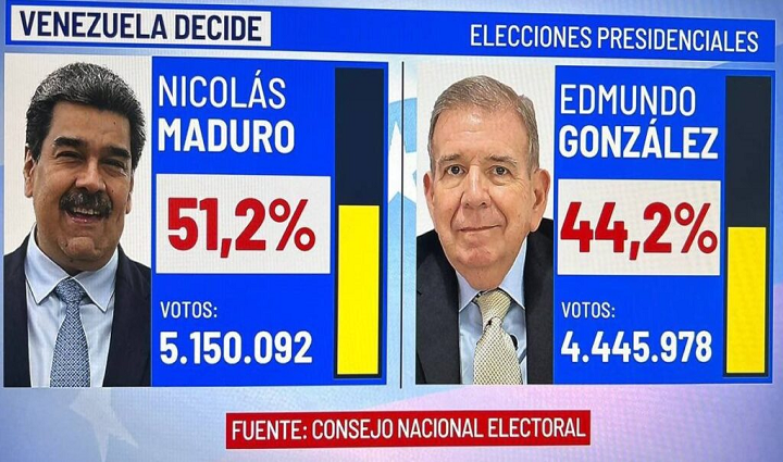 De acuerdo al primer informe, el candidato de la oposición mayoritaria, Edmundo González Urrutia, obtuvo 4.445.978 votos, representando el 44,2 % de los sufragios. El CNE prometió publicar en su página web el desglose de los resultados mesa por mesa en las próximas horas y proporcionar un informe digital a los 38 partidos políticos participantes.